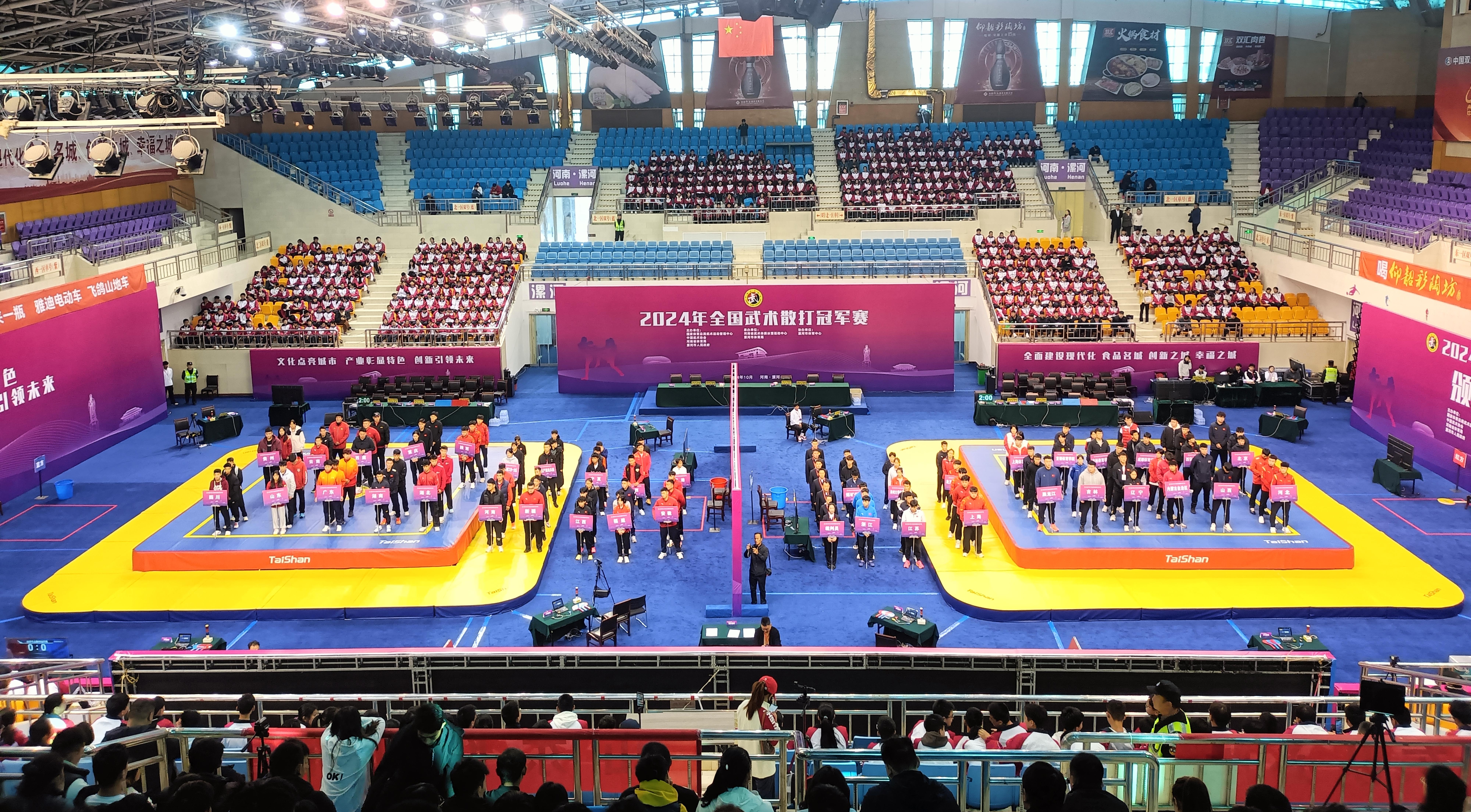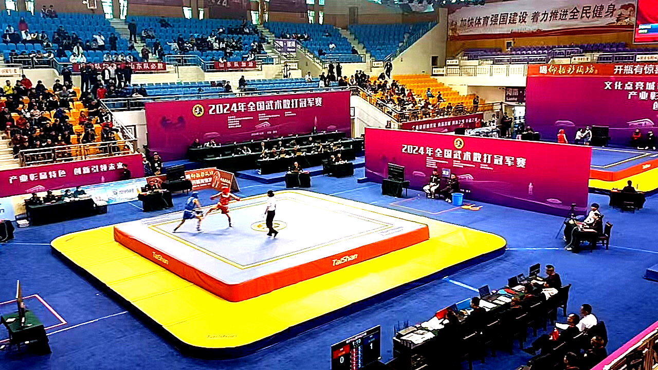 10月24日,全国武术散打冠军赛在河南省漯河体育中心体育馆开打,来自国内顶级40支代表队的近400名武术散打健儿汇聚漯河,给观众带来一场展现武术精髓的盛宴。球王会体育成为本届赛事场地器材、训练器材供应商与服务商。
