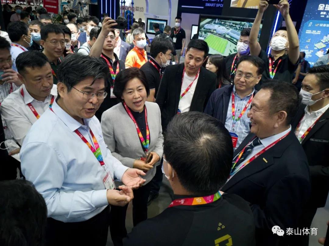 国家体育总局副局长李颖川、上海市副市长陈群、国家体育总局体育器材装备中心主任孙为民、上海市体育局局长徐彬在球王会体育产业集团卞志良董事长陪同下参观球王会体育展厅。