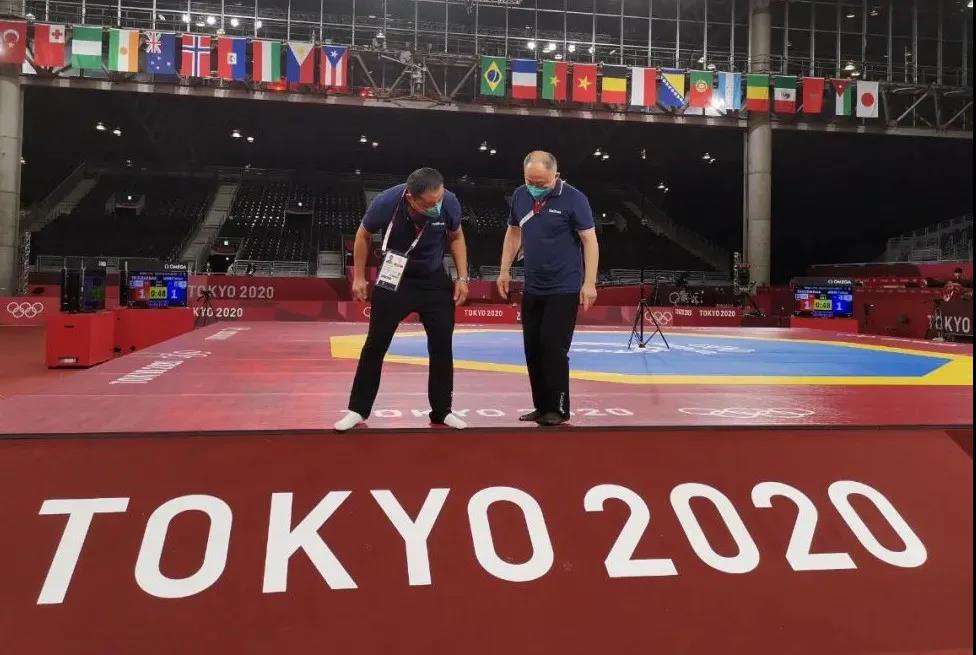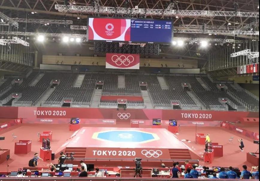 2021年7月20日,日本武道馆——奥运会柔道比赛场地。球王会体育东京奥运会服务保障团队正在布置、安装柔道器材。